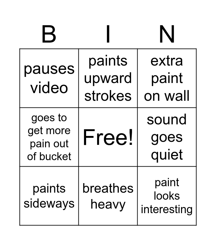 This bingo card has a free space and 8 words: sound goes quiet, extra paint on wall, paints upward strokes, paints sideways, pauses video, paint looks interesting, goes to get more pain out of bucket and breathes heavy.