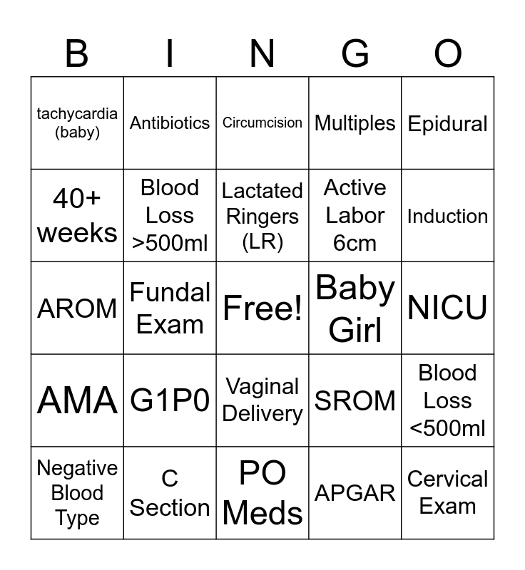 This bingo card has a free space and 24 words: G1P0, C Section, Lactated Ringers (LR), Negative Blood Type, Epidural, tachycardia (baby), 40+ weeks, Antibiotics, Baby Girl, Vaginal Delivery, Active Labor 6cm, AROM, SROM, Blood Loss <500ml, Blood Loss >500ml, APGAR, NICU, Circumcision, Induction, Fundal Exam, Cervical Exam, AMA, Multiples and PO Meds.