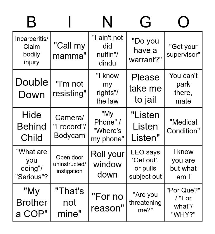 This bingo card has 33 words: "Por Que?" / "For what"/ "WHY?", "Stop Touching Me", Camera/ "I record"/ Bodycam, "I can't Breathe", "What are you doing"/ "Serious"?, "I'm not resisting", "Get your supervisor", "My Brother a COP", "Call my mamma", "My/I'm lawyer"/ "lawsuit", "I know my rights"/ the law, "I ain't not did nuffin"/ dindu, No Physical License, "No drinks"/ "Only 2 drinks", "Listen Listen Listen", You can't park there, mate, "That's not mine", Hide Behind Child, Open door uninstructed/ instigation, LEO says 'Get out', or pulls subject out, Roll your window down, Passenger needs to shut up, Incarceritis/ Claim bodily injury, "Medical Condition", "For no reason", "My Phone" / "Where's my phone", "Do you have a warrant?", Please take me to jail, Double Down, I know you are but what am I, "I'm being harassed"/ "I am victim", "Are you threatening me?" and Actually threatening/challenging.