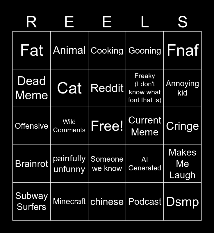 This bingo card has a free space and 24 words: painfully unfunny, Minecraft, Reddit, Subway Surfers, Fnaf, Fat, Dead Meme, Animal, Current Meme, Someone we know, Freaky (I don't know what font that is), Offensive, AI Generated, Makes Me Laugh, Cat, Podcast, Cringe, Cooking, Annoying kid, Wild Comments, Dsmp, Brainrot, Gooning and chinese.
