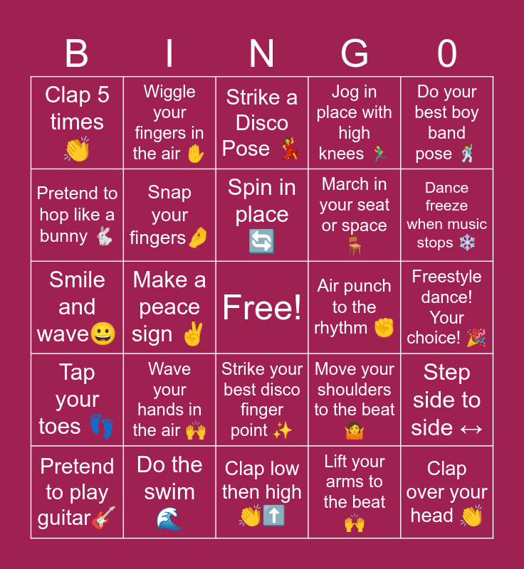 This bingo card has a free space and 29 words: Do the Twistπ΅, Do the swim π, Strike a Disco Pose π, March or step in place πΆ, Do your best boy band pose πΊ, Clap 5 times π, Snap your fingersπ€, Spin in place π, Air punch to the rhythm β, Step side to side βοΈ, Pretend to play guitarπΈ, Make a peace sign βοΈ, Lift your arms to the beat π, Clap over your head π, Smile and waveπ, Take a groovy walk or roll π, Clap low then high πβ¬οΈ, Move your shoulders to the beat π€·, Dance freeze when music stops βοΈ, Tap your toes π£, Wave your hands in the air π, Do a fun spin or head turn π, March in your seat or space πͺ, Freestyle dance! Your choice! π, Pretend to hop like a bunny π, Wiggle your fingers in the air β, Strike your best disco finger point β¨, Jog in place with high knees πββοΈ and Do a fun βair drumβ beat π₯.