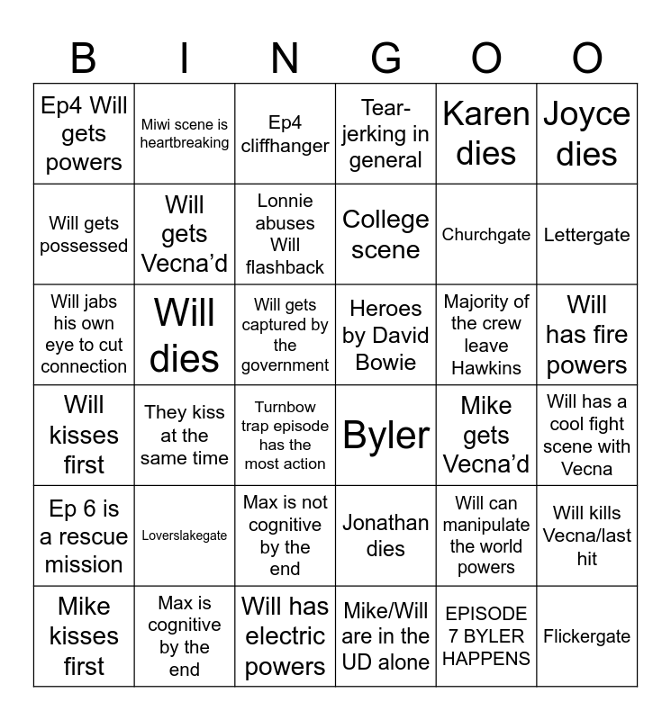 This bingo card has 36 words: Jonathan dies, Max is not cognitive by the end, Mike/Will are in the UD alone, Will gets possessed, Will kisses first, Heroes by David Bowie, Will gets Vecna’d, Will has electric powers, Karen dies, Will can manipulate the world powers, Lettergate, Tear-jerking in general, Will kills Vecna/last hit, Will dies, College scene, Ep4 Will gets powers, Ep 6 is a rescue mission, Majority of the crew leave Hawkins, Will jabs his own eye to cut connection, Ep4 cliffhanger, Will gets captured by the government, They kiss at the same time, Byler, Turnbow trap episode has the most action, Mike gets Vecna’d, Miwi scene is heartbreaking, Churchgate, Max is cognitive by the end, Lonnie abuses Will flashback, Joyce dies, Flickergate, Mike kisses first, Will has a cool fight scene with Vecna, Will has fire powers, Loverslakegate and EPISODE 7 BYLER HAPPENS.