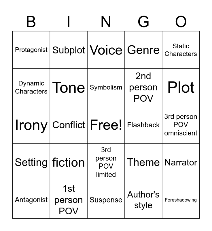 This bingo card has a free space and 24 words: fiction, 1st person POV, Symbolism, Antagonist, Static Characters, Protagonist, Dynamic Characters, Subplot, Flashback, 3rd person POV limited, 2nd person POV, Irony, Theme, Narrator, Tone, Author's style, 3rd person POV omniscient, Voice, Plot, Conflict, Foreshadowing, Setting, Genre and Suspense.