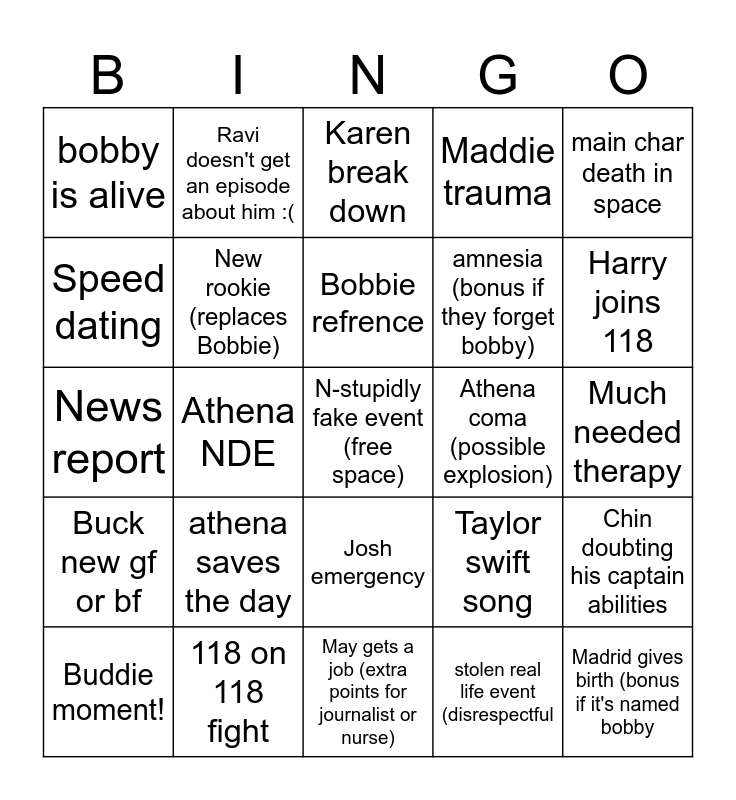 This bingo card has a free space and 24 words: Buddie moment!, athena saves the day, Bobbie refrence, stolen real life event (disrespectful, main char death in space, bobby is alive, Ravi doesn't get an episode about him :(, Karen break down, Athena coma (possible explosion), Much needed therapy, News report, New rookie (replaces Bobbie), Taylor swift song, Chin doubting his captain abilities, Speed dating, 118 on 118 fight, May gets a job (extra points for journalist or nurse), Maddie trauma, Harry joins 118, Buck new gf or bf, Athena NDE, Josh emergency, amnesia (bonus if they forget bobby) and Madrid gives birth (bonus if it's named bobby.