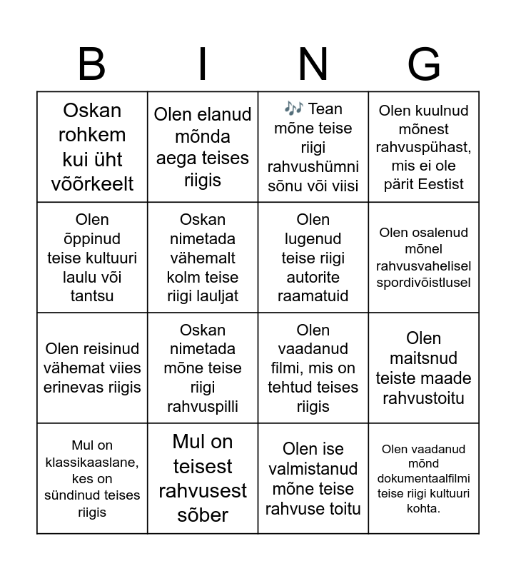 This bingo card has 16 words: Mul on teisest rahvusest sõber, Olen maitsnud teiste maade rahvustoitu, 🎶 Tean mõne teise riigi rahvushümni sõnu või viisi, Oskan rohkem kui üht võõrkeelt, Olen reisinud vähemat viies erinevas riigis, Olen elanud mõnda aega teises riigis, Olen vaadanud filmi, mis on tehtud teises riigis, Olen ise valmistanud mõne teise rahvuse toitu, Olen õppinud teise kultuuri laulu või tantsu, Oskan nimetada vähemalt kolm teise riigi lauljat, Mul on klassikaaslane, kes on sündinud teises riigis, Olen kuulnud mõnest rahvuspühast, mis ei ole pärit Eestist, Oskan nimetada mõne teise riigi rahvuspilli, Olen osalenud mõnel rahvusvahelisel spordivõistlusel, Olen lugenud teise riigi autorite raamatuid and Olen vaadanud mõnd dokumentaalfilmi teise riigi kultuuri kohta..