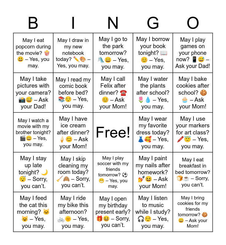 This bingo card has a free space and 33 words: May I play outside after school? π³π β Yes, you may., May I watch TV tonight? πΊπ β Sorry, you canβt., May I have ice cream after dinner? π¦π β Ask your Mom!, May I go to my friendβs house tomorrow? π π β Yes, you may., May I stay up late tonight? ππ΄ β Sorry, you canβt., May I read my comic book before bed? ππ β Yes, you may., May I play games on your phone now? π±π β Ask your Dad!, May I feed the cat this morning? π±πΊ β Yes, you may., May I draw in my new notebook today? βοΈπ¨ β Yes, you may., May I eat snacks in my room tonight? πͺπ β Sorry, you canβt., May I call Felix after dinner? βοΈπ β Ask your Mom!, May I go to the park tomorrow? ππ β Yes, you may., May I bring my toy to school? π§Έπ β Sorry, you canβt., May I use your laptop tonight? π»π β Ask your Dad!, May I wear my favorite dress today? ππ₯° β Yes, you may., May I bake cookies after school? πͺπ§ β Ask your Mom!, May I ride my bike this afternoon? π²π β Yes, you may., May I watch a movie with my brother tonight? π¬π β Yes, you may., May I skip cleaning my room today? π§Ήπ β Sorry, you canβt., May I paint my nails after homework? π π β Ask your Mom!, May I play soccer with my friends tomorrow? β½π β Yes, you may., May I sleep over at Jungkookβs house? π€π β Ask your Dad!, May I eat popcorn during the movie? πΏπ β Yes, you may., May I use your markers for art class? ποΈπ β Yes, you may., May I open my birthday present early? ππ β Sorry, you canβt., May I bring cookies for my friends tomorrow? πͺπ β Ask your Mom!, May I borrow your book tonight? ππ β Yes, you may., May I water the plants after school? π·π§ β Yes, you may., May I take pictures with your camera? πΈπ β Ask your Dad!, May I eat breakfast in bed tomorrow? πβ β Sorry, you canβt., May I help you cook dinner tonight? π²π β Yes, you may., May I listen to music while I study? π§π β Yes, you may. and May I buy a new pencil case after school? βοΈπ β Ask your Mom!.