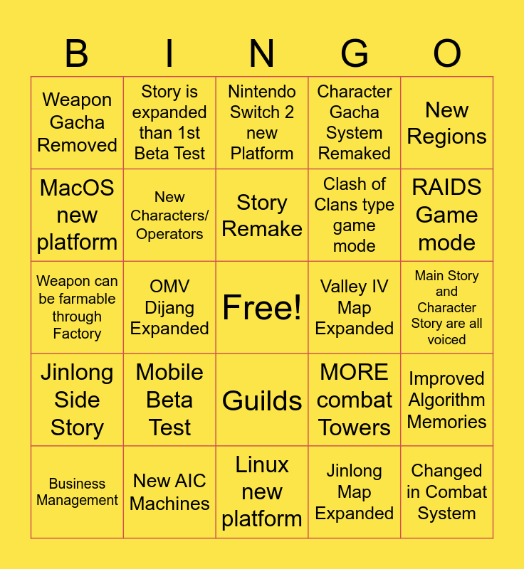 This bingo card has a free space and 24 words: Mobile Beta Test, New AIC Machines, Story Remake, Business Management, New Regions, Weapon Gacha Removed, MacOS new platform, Story is expanded than 1st Beta Test, Valley IV Map Expanded, Guilds, Clash of Clans type game mode, Weapon can be farmable through Factory, MORE combat Towers, Improved Algorithm Memories, New Characters/ Operators, Jinlong Map Expanded, Main Story and Character Story are all voiced, Nintendo Switch 2 new Platform, RAIDS Game mode, OMV Dijang Expanded, Changed in Combat System, Jinlong Side Story, Character Gacha System Remaked and Linux new platform.