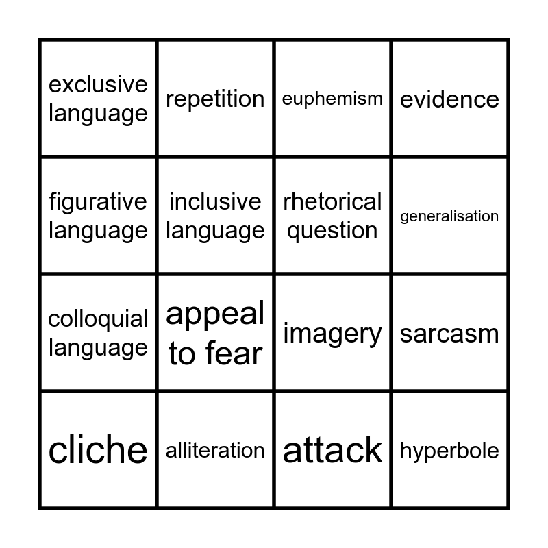 This bingo card has 16 words: alliteration, sarcasm, euphemism, exclusive language, colloquial language, repetition, imagery, attack, figurative language, inclusive language, cliche, evidence, appeal to fear, generalisation, rhetorical question and hyperbole.