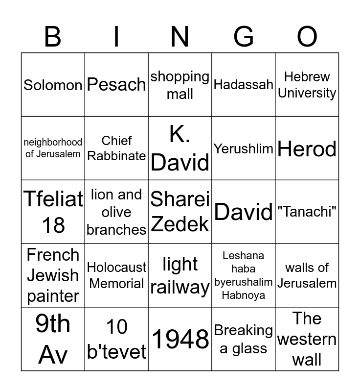 This bingo card has a free space and 37 words: 1967, the old City, Moshe Montefiore, Chief Rabbinate, walls of Jerusalem, Holocaust Memorial, K. David, Har Herzl, Hebrew University, 8, lion and olive branches, Hadassah, The western wall, "Tanachi", neighborhood of Jerusalem, French Jewish painter, The market, shopping mall, light railway, David, Solomon, Herod, 9th Av, 1948, Benjamin, Breaking a glass, Pesach, shavout, sukkot, 17 of Tamuz, 9 b'Av, 10 b'tevet, Tfeliat 18, 500, Leshana haba byerushalim Habnoya, Yerushlim and Beit hamikdash.