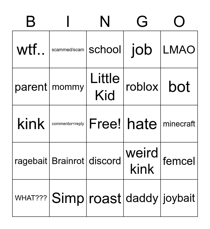 This bingo card has a free space and 24 words: Brainrot, Simp, Little Kid, WHAT???, LMAO, wtf.., parent, scammed/scam, hate, discord, roblox, kink, weird kink, femcel, mommy, daddy, minecraft, school, bot, commentor<reply, joybait, ragebait, job and roast.