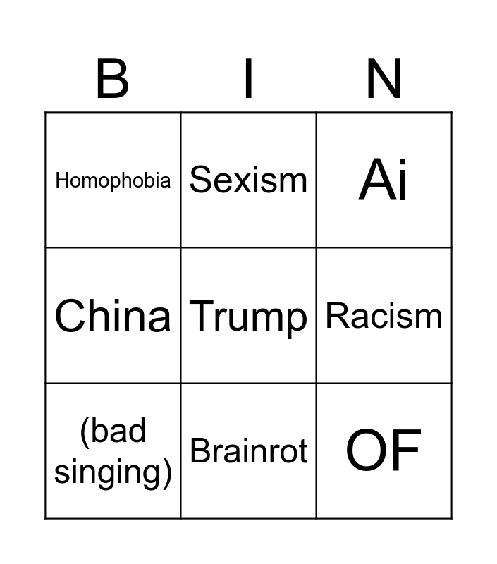This bingo card has a free space and 8 words: Racism, Ai, Sexism, (bad singing), Homophobia, OF, China and Brainrot.