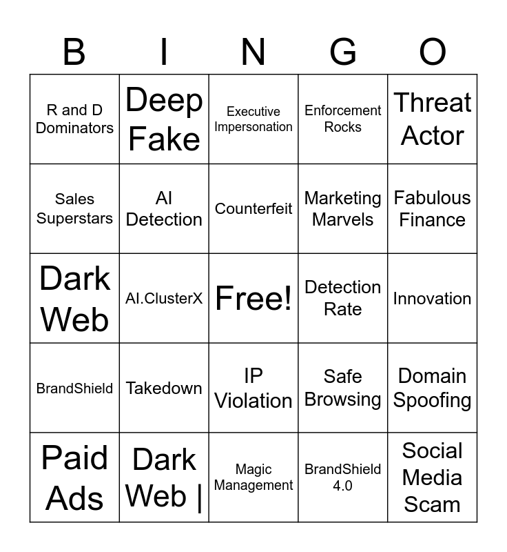 This bingo card has a free space and 32 words: BrandShield 4.0, BrandShield 4.0, AI.ClusterX, Technology, BrandShield, AI Detection, Threat Actor, Domain Spoofing, Deep Fake, Brand Protection, Counterfeit, Executive Impersonation, Threat Map, Incident Response, Detection Rate, Secure Link, Paid Ads, Dark Web, IP Violation, Takedown, Safe Browsing, Clustering, Innovation, Dark Web |, Social Media Scam, Enforcement Rocks, Marketing Marvels, Sales Superstars, R and D Dominators, Magic Management, Thriving Threat Hunters and Fabulous Finance.