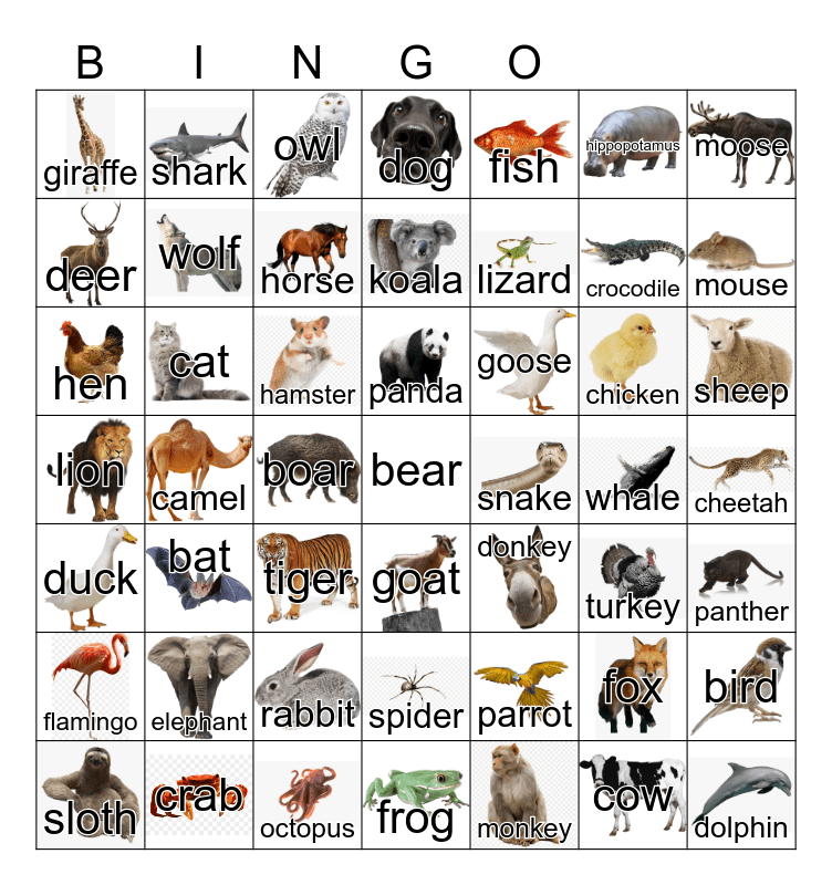 This bingo card has 58 images and 60 words: bear, lion, hedgehog, cat, boar, fox, moose, squirrel, wolf, bird, dog, rabbit, hippopotamus, tiger, cow, giraffe, crocodile, fish, butterfly, deer, mouse, owl, sheep, chicken, zebra, goat, duck, pig, horse, turkey, rhino, elephant, monkey, dolphin, shark, snake, spider, lizard, donkey, koala, parrot, hamster, hen, gorilla, goose, cheetah, sloth, octopus, frog, panda, camel, kangaroo, flamingo, whale, bat, panther, crab, penguin, bear and bear.