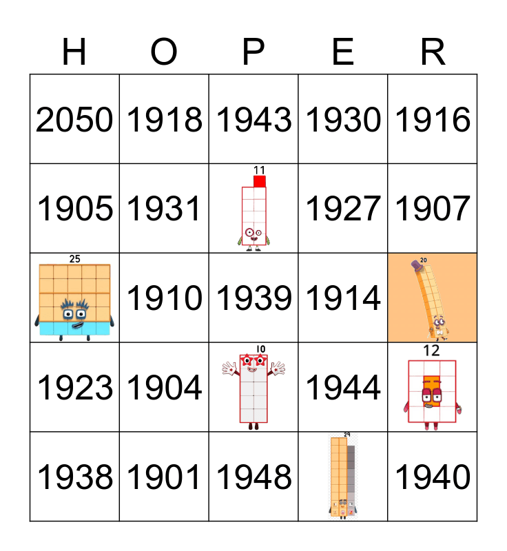 This bingo card has 30 images and 57 words: 1901, 1902, 1903, 1904, 1905, 1906, 1907, 1908, 1909, 1910, 1911, 1912, 1913, 1914, 1915, 1916, 1917, 1918, 1919, 1920, 1921, 1922, 1923, 1924, 1925, 1926, 1927, 1928, 1929, 1930, 1931, 1932, 1933, 1934, 1935, 1936, 1937, 1938, 1939, 1940, 1941, 1942, 1943, 1944, 1945, 1946, 1947, 1948, 1949, 1950, 1901-1910, 1911-1920, 1921-1930, 1931-1940, 1941-1950, 2050 and 2150.