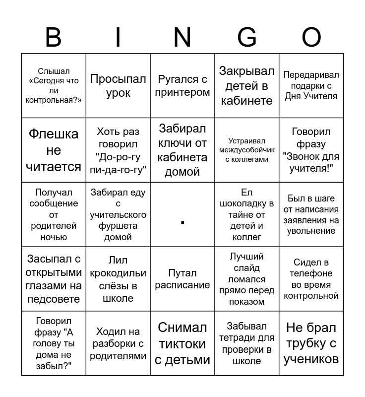 This bingo card has a free space and 24 words: Лил крокодильи слёзы в школе, Ходил на разборки с родителями, Забирал ключи от кабинета домой, Говорил фразу "А голову ты дома не забыл?", Передаривал подарки с Дня Учителя, Слышал «Сегодня что ли контрольная?», Флешка не читается, Просыпал урок, Ел шоколадку в тайне от детей и коллег, Путал расписание, Устраивал междусобойчик с коллегами, Получал сообщение от родителей ночью, Лучший слайд ломался прямо перед показом, Сидел в телефоне во время контрольной, Хоть раз говорил "До-ро-гу пи-да-го-гу", Забывал тетради для проверки в школе, Был в шаге от написания заявления на увольнение, Ругался с принтером, Говорил фразу "Звонок для учителя!", Забирал еду с учительского фуршета домой, Не брал трубку с учеников, Засыпал с открытыми глазами на педсовете, Закрывал детей в кабинете and Снимал тиктоки с детьми.