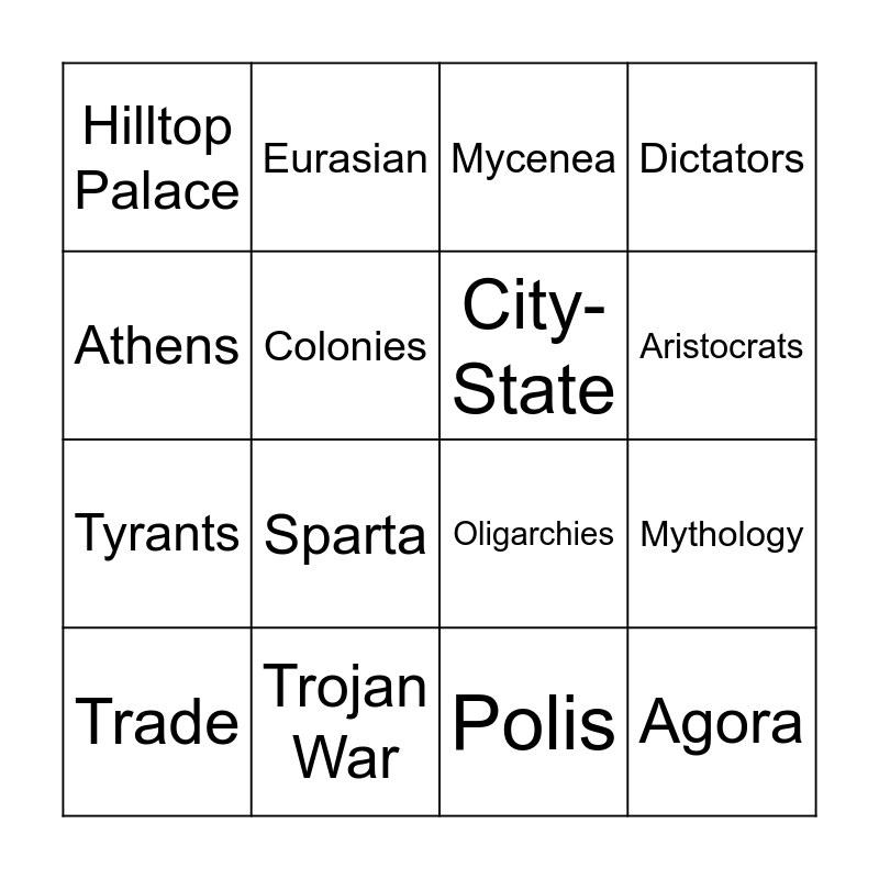 This bingo card has 21 words: Trojan War, Dorians, Eurasian, Dark Age, Polis, City-State, Hilltop Palace, Mycenea, Oligarchies, Aristocrats, Tyrants, Dictators, Agora, Marketplace, Colonies, Economy, Trade, Sparta, Athens, Mythology and 1200 - 800 BCE.