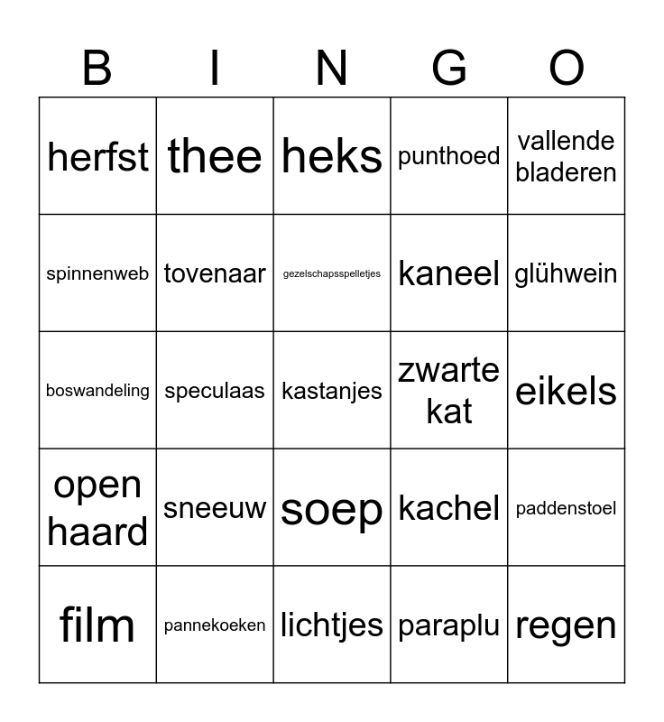 This bingo card has 30 words: pannekoeken, pompoen, speculaas, dennenappel, herfst, heks, tovenaar, soep, zwarte kat, lichtjes, eikels, kastanjes, paraplu, regen, glühwein, chocomelk, kachel, open haard, sneeuw, vallende bladeren, boswandeling, koffie, thee, kaneel, spinnenweb, punthoed, paddenstoel, film, gezelschapsspelletjes and griezelen.