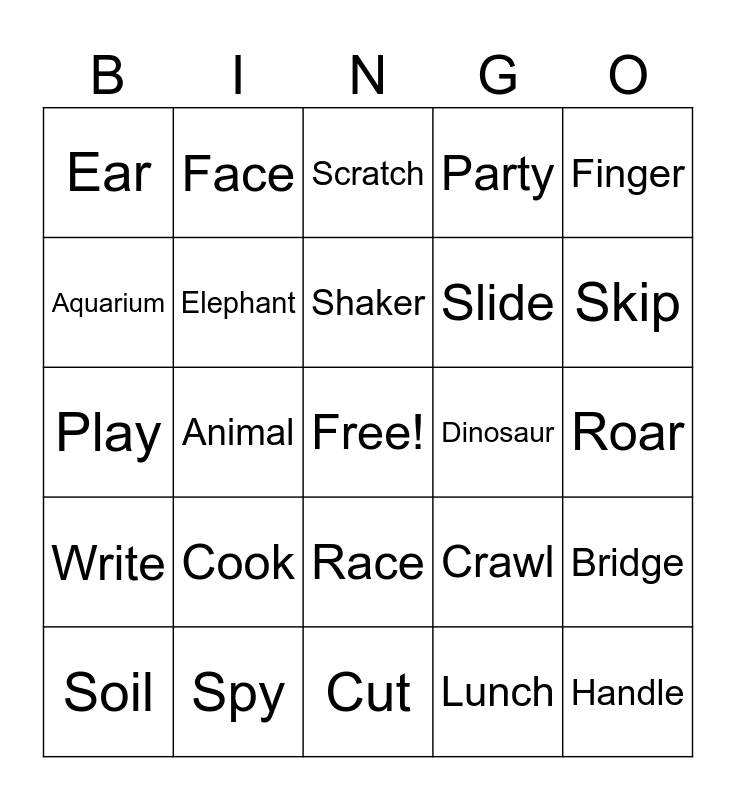 This bingo card has a free space and 34 words: School, Lunch, Shut, Rabbit, Write, Elephant, Finger, Soil, Face, Hop, Shaker, Scratch, Build, Blow, Dinosaur, Skip, Spy, Play, Cook, Crawl, Race, Push, Ear, Roar, Cut, Handle, Party, Jobs, Slide, Aquarium, Carrot, Animal, Bridge and Paint.