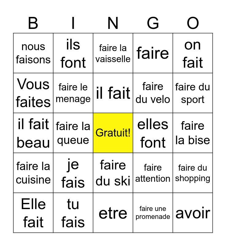 This bingo card has a free space and 24 words: je fais, tu fais, il fait, Elle fait, on fait, nous faisons, Vous faites, ils font, elles font, faire du ski, faire du velo, il fait beau, faire attention, faire du shopping, faire le menage, faire une promenade, faire la bise, faire la vaisselle, faire du sport, faire la queue, avoir, faire la cuisine, faire and etre.