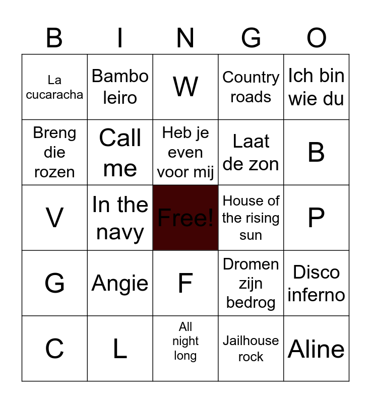 This bingo card has a free space and 49 words: Green green grass, Aline, Als de nacht verdwijnt, All night long, Angie, Baby come back, Bambo leiro, Born to be alive, Breng die rozen, California blue, Call me, Country roads, Disco inferno, Dromen zijn bedrog, Fernando, Gloria, Heb je even voor mij, House of the rising sun, I”ll go where the music takes me, Ich bin wie du, In the navy, Jailhouse rock, La cucaracha, Laat de zon, A, B, C, E, F, G, H, I, J, K, L, M, N, O, P, Q, R, S, T, U, V, W, X, Y and Z.