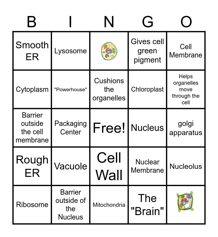 This bingo card has 2 images, a free space and 22 words: Vacuole, Barrier outside of the Nucleus, Cushions the organelles, Ribosome, Cell Membrane, Smooth ER, Cytoplasm, Lysosome, Nucleus, Cell Wall, Chloroplast, Barrier outside the cell membrane, Nuclear Membrane, Nucleolus, "Powerhouse", The "Brain", golgi apparatus, Helps organelles move through the cell, Packaging Center, Rough ER, Gives cell green pigment and Mitochondria.