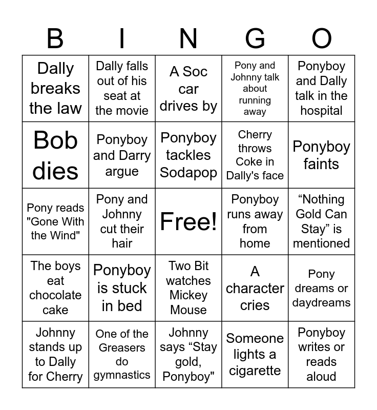 This bingo card has a free space and 31 words: Johnny says “Stay gold, Ponyboy", The rumble happens, Pony and Johnny cut their hair, A sunset is shown or mentioned, Dally breaks the law, A Soc car drives by, Ponyboy and Darry argue, A character cries, Ponyboy runs away from home, Someone lights a cigarette, “Nothing Gold Can Stay” is mentioned, Ponyboy writes or reads aloud, The church catches fire, A character says “tuff”, Ponyboy faints, Johnny talks about dying, Pony dreams or daydreams, Ponyboy is stuck in bed, The boys eat chocolate cake, Two Bit watches Mickey Mouse, Ponyboy and Dally talk in the hospital, Two Bit confronts Johnny's mom, Johnny stands up to Dally for Cherry, Dally falls out of his seat at the movie, Cherry throws Coke in Dally's face, Bob dies, Pony and Johnny talk about running away, Pony reads "Gone With the Wind", One of the Greasers do gymnastics, Ponyboy tackles Sodapop and Someone mentions Sandy leaving Soda.