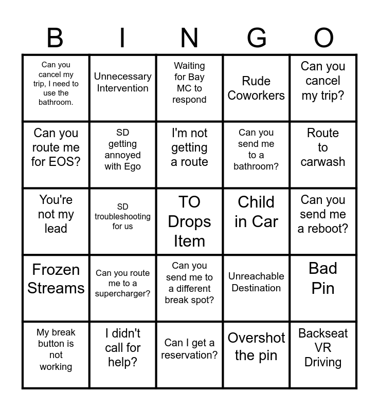 This bingo card has a free space and 24 words: Can you route me to a supercharger?, I didn't call for help?, I'm not getting a route, My break button is not working, Can you cancel my trip?, Can you cancel my trip, I need to use the bathroom., Can you route me for EOS?, Unnecessary Intervention, Child in Car, Can you send me to a different break spot?, Can you send me to a bathroom?, You're not my lead, Unreachable Destination, Bad Pin, SD getting annoyed with Ego, Overshot the pin, Can you send me a reboot?, Waiting for Bay MC to respond, Route to carwash, SD troubleshooting for us, Backseat VR Driving, Frozen Streams, Rude Coworkers and Can I get a reservation?.