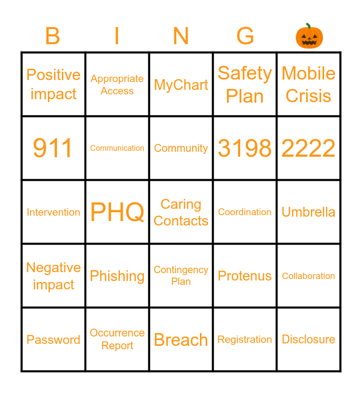 This bingo card has a free space and 27 words: Protenus, HIPPA, 3198, Breach, 911, MyChart, Appropriate Access, Negative impact, Coordination, Collaboration, Intervention, Safety Plan, Password, Occurrence Report, 2222, Police Officers, Communication, Community, Phishing, Positive impact, Umbrella, Registration, PHQ, Disclosure, Contingency Plan, Mobile Crisis and Appropriate Access.