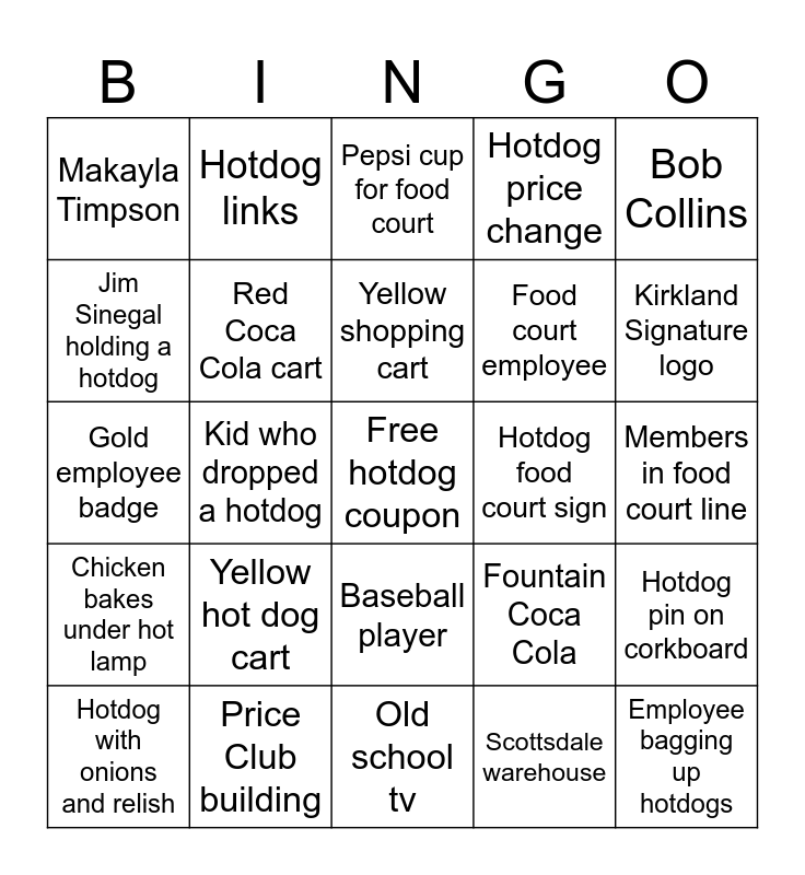 This bingo card has a free space and 24 words: Yellow hot dog cart, Price Club building, Yellow shopping cart, Hotdog with onions and relish, Bob Collins, Makayla Timpson, Jim Sinegal holding a hotdog, Hotdog links, Hotdog food court sign, Baseball player, Food court employee, Gold employee badge, Fountain Coca Cola, Hotdog pin on corkboard, Red Coca Cola cart, Scottsdale warehouse, Members in food court line, Pepsi cup for food court, Kirkland Signature logo, Kid who dropped a hotdog, Employee bagging up hotdogs, Chicken bakes under hot lamp, Hotdog price change and Old school tv.