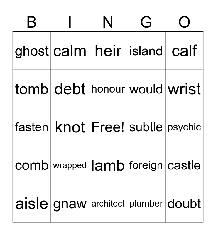 This bingo card has a free space and 24 words: wrapped, gnaw, honour, aisle, calf, ghost, tomb, calm, subtle, lamb, would, fasten, foreign, castle, debt, plumber, psychic, heir, wrist, knot, doubt, comb, island and architect.