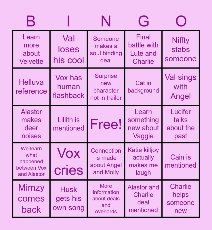 This bingo card has a free space and 24 words: Vox cries, Husk gets his own song, Surprise new character not in trailer, Mimzy comes back, Niffty stabs someone, Learn more about Velvette, Helluva reference, Val loses his cool, Learn something new about Vaggie, Connection is made about Angel and Molly, Cat in background, Alastor makes deer noises, Katie killjoy actually makes me laugh, Cain is mentioned, Vox has human flashback, Alastor and Charlie deal mentioned, Lucifer talks about the past, Someone makes a soul binding deal, Val sings with Angel, Lillith is mentioned, Charlie helps someone new, We learn what happened between Vox and Alastor, Final battle with Lute and Charlie and More information about deals and overlords.