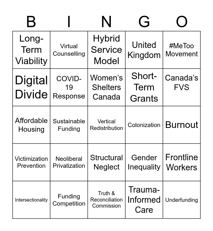 This bingo card has a free space and 24 words: Neoliberal Privatization, Funding Competition, Women’s Shelters Canada, Intersectionality, #MeToo Movement, Long-Term Viability, Digital Divide, Virtual Counselling, Colonization, Structural Neglect, Short-Term Grants, Affordable Housing, Gender Inequality, Frontline Workers, COVID-19 Response, Trauma-Informed Care, Burnout, Hybrid Service Model, Canada’s FVS, Sustainable Funding, Underfunding, Victimization Prevention, United Kingdom and Truth & Reconciliation Commission.