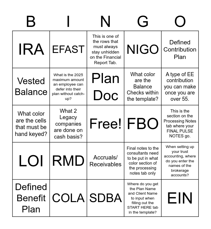 This bingo card has a free space and 24 words: RMD, COLA, Plan Doc, Defined Benefit Plan, Defined Contribution Plan, IRA, Vested Balance, EFAST, FBO, Accruals/ Receivables, What color are the Balance Checks within the template?, What color are the cells that must be hand keyed?, Final notes to the consultants need to be put in what color section of the processing notes tab only, When setting up your trust accounting, where do you enter the names of the brokerage accounts?, What is the 2025 maximum amount an employee can defer into their plan without catch-up?, Where do you get the Plan Name and Client Name to input when filling out the START HERE tab in the template?, This is the section on the Processing Notes tab where your FINAL PULSE NOTES go., This is one of the rows that must always stay unhidden on the Financial Report Tab., A type of EE contribution you can make once you are over 55., What 2 Legacy companies are done on cash basis?, EIN, LOI, NIGO and SDBA.