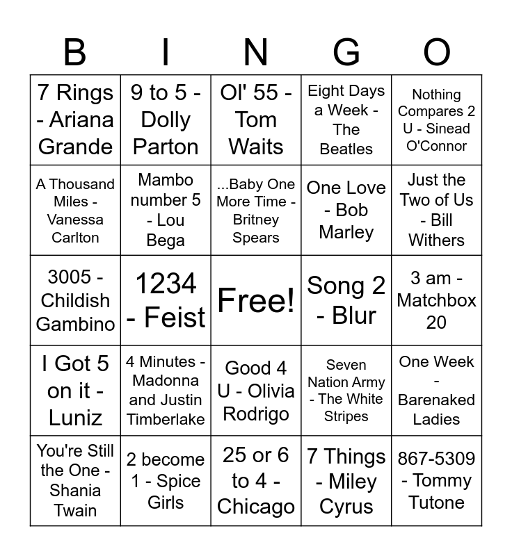 This bingo card has a free space and 50 words: I'm Gonna Be (500 Miles) - The Proclaimers, 867-5309 - Tommy Tutone, 22 - Taylor Swift, 25 or 6 to 4 - Chicago, 4 Minutes - Madonna and Justin Timberlake, Summer of 69 - Bryan Adams, 9 to 5 - Dolly Parton, 99 Luftballoons - Nena, A Thousand Miles - Vanessa Carlton, Edge of 17 - Stevie Nicks, Mambo number 5 - Lou Bega, Eight Days a Week - The Beatles, One Week - Barenaked Ladies, Seven Nation Army - The White Stripes, It Takes 2 - Rob Base and DJ EZ Rock, One Way or Another - Blondie, ...Baby One More Time - Britney Spears, Song 2 - Blur, Sk8r Boi - Avril Levigne, Nothing Compares 2 U - Sinead O'Connor, 1234 - Feist, 7 Things - Miley Cyrus, 7 Rings - Ariana Grande, One Love - Bob Marley, One - U2, Two Princes - Spin Doctors, Just the Two of Us - Bill Withers, 1979 - Smashing Pumpkins, Ol' 55 - Tom Waits, Good 4 U - Olivia Rodrigo, Counting 5-4-3-2-1 -Thursday, Three Times a Lady - The Commodores, Plus Ones - Okkervil River, 1999 - Prince, 2 become 1 - Spice Girls, Fifteen - Taylor Swift, A Pirate looks at 40 - Jimmy Buffet, December 1963 - The Four Seasons, Less than Zero - Elvis Costello, 3 am - Matchbox 20, The One - Backstreet Boys, Year 3000 - The Jonas Brothers, 1985 - Bowling for Soup, 5 Years Time - Noah and the Whale, You're Still the One - Shania Twain, 3005 - Childish Gambino, FOURFIVESECONDS - Rhianna, 7/11 - Beyonce, I Got 5 on it - Luniz and Two Black Cadillacs - Carrie Underwood.