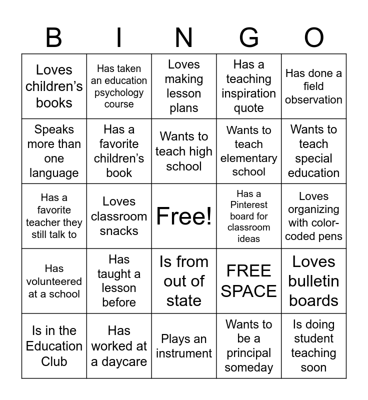 This bingo card has a free space and 25 words: Has taught a lesson before, Plays an instrument, Wants to teach high school, Is in the Education Club, Has done a field observation, Loves children’s books, Speaks more than one language, Has taken an education psychology course, Has a Pinterest board for classroom ideas, Is from out of state, Wants to teach elementary school, Has a favorite teacher they still talk to, FREE SPACE, Loves bulletin boards, Has a favorite children’s book, Has classroom decor already, Loves organizing with color-coded pens, Loves making lesson plans, Wants to teach special education, Loves classroom snacks, Is doing student teaching soon, Has worked at a daycare, Has volunteered at a school, Has a teaching inspiration quote and Wants to be a principal someday.