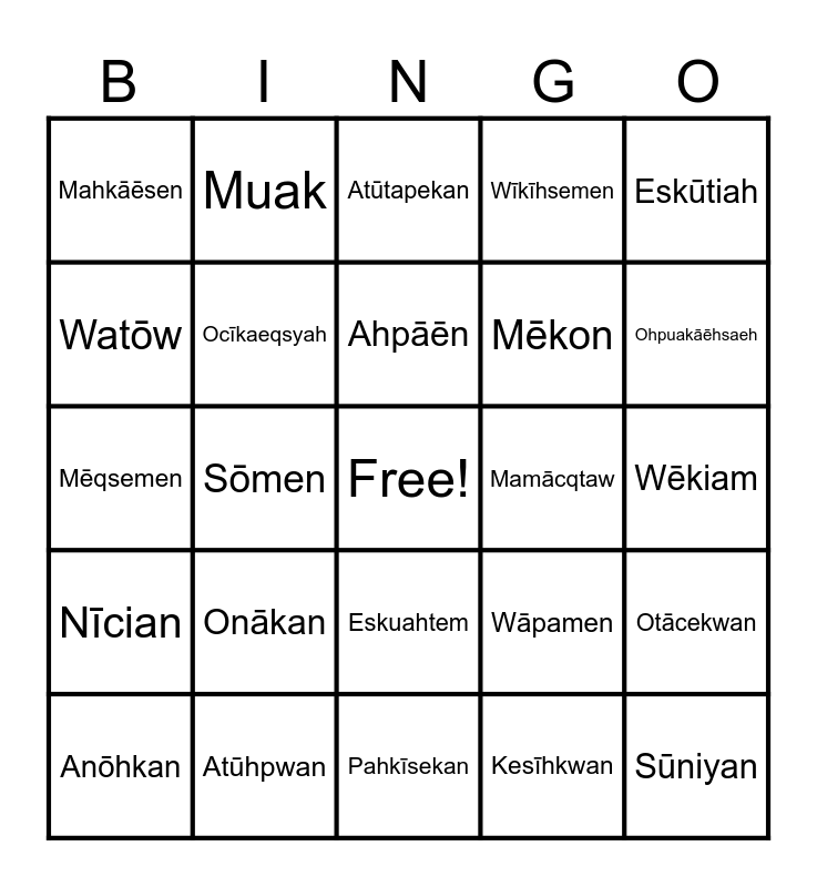 This bingo card has a free space and 27 words: Wāpamen, Moswāēn, Mēkon, Pahkīsekan, Watōw, Atūtapekan, Muak, Nīcian, Mamācqtaw, Otācekwan, Mēqsemen, Wīkīhsemen, Anōhkan, Atūhpwan, Ohpuakāēhsaeh, Anīpiahkan, Ocīkaeqsyah, Ahpāēn, Onākan, Mahkāēsen, Wēkiam, Kesīhkwan, Sōmen, Sūniyan, Eskuahtem, Eskūtiah and Kaeqcekam.