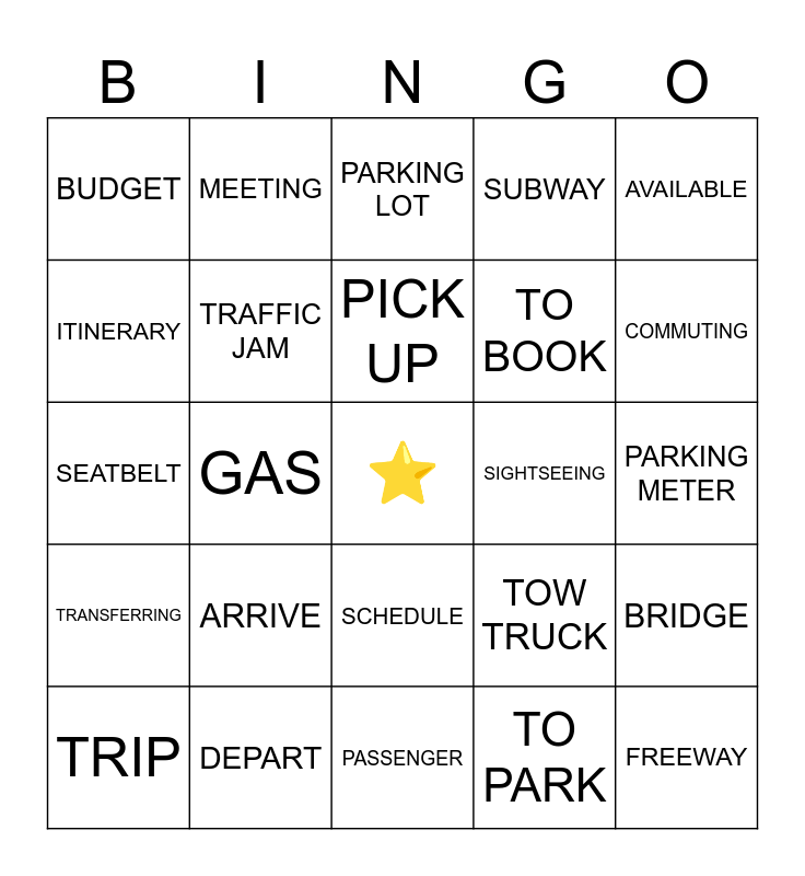 This bingo card has a free space and 24 words: ARRIVE, DEPART, PICK UP, TRIP, AVAILABLE, BUDGET, ITINERARY, MEETING, SIGHTSEEING, SCHEDULE, TO BOOK, SEATBELT, TOW TRUCK, BRIDGE, TRAFFIC JAM, TO PARK, PARKING METER, PARKING LOT, COMMUTING, GAS, FREEWAY, TRANSFERRING, SUBWAY and PASSENGER.