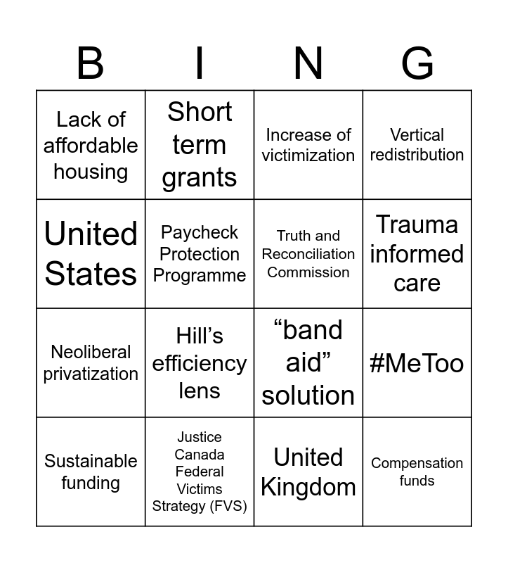 This bingo card has 16 words: Justice Canada Federal Victims Strategy (FVS), #MeToo, Increase of victimization, Lack of affordable housing, Neoliberal privatization, Short term grants, “band aid” solution, United Kingdom, United States, Paycheck Protection Programme, Sustainable funding, Vertical redistribution, Hill’s efficiency lens, Trauma informed care, Truth and Reconciliation Commission and Compensation funds.
