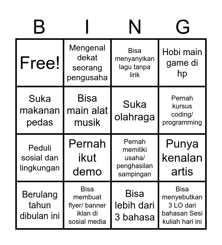 This bingo card has 16 words: Berulang tahun dibulan ini, Bisa membuat flyer/ banner iklan di sosial media, Bisa menyanyikan lagu tanpa lirik, Hobi main game di hp, Suka makanan pedas, Mengenal dekat seorang pengusaha, Pernah memiliki usaha/ penghasilan sampingan, Punya kenalan artis, Free!, Bisa main alat musik, Bisa lebih dari 3 bahasa, Pernah kursus coding/ programming, Peduli sosial dan lingkungan, Pernah ikut demo, Suka olahraga and Bisa menyebutkan 3 LO dari bahasan Sesi kuliah hari ini.