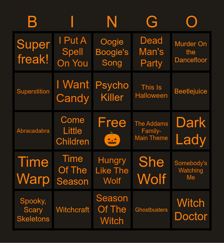 This bingo card has a free space and 28 words: Somebody's Watching Me, Thriller, This Is Halloween, Ghostbusters, Superstition, Oogie Boogie's Song, I Put A Spell On You, Time Warp, The Addams Family- Main Theme, Spooky, Scary Skeletons, Abracadabra, Dead Man's Party, Witchcraft, Season Of The Witch, Beetlejuice, (Don't Fear) The Reaper, Time Of The Season, I Want Candy, Psycho Killer, Hungry Like The Wolf, Super freak!, Heads Will Roll, Witch Doctor, Come Little Children, Dark Lady, She Wolf, Murder On the Dancefloor and Your Idol.