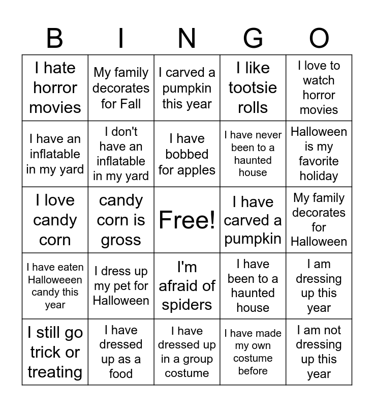 This bingo card has a free space and 24 words: I dress up my pet for Halloween, I have dressed up as a food, I have bobbed for apples, I still go trick or treating, I love to watch horror movies, I hate horror movies, I have an inflatable in my yard, My family decorates for Fall, I have carved a pumpkin, I'm afraid of spiders, I have never been to a haunted house, I love candy corn, I have been to a haunted house, I am dressing up this year, I don't have an inflatable in my yard, I have made my own costume before, My family decorates for Halloween, I carved a pumpkin this year, Halloween is my favorite holiday, candy corn is gross, I am not dressing up this year, I have eaten Halloweeen candy this year, I like tootsie rolls and I have dressed up in a group costume.