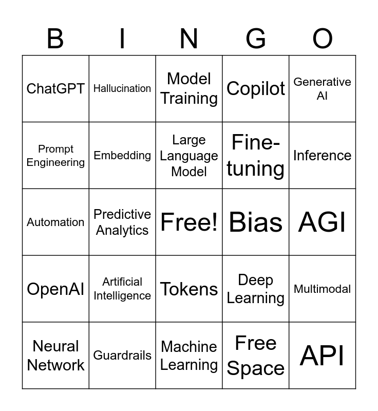 This bingo card has a free space and 25 words: Artificial Intelligence, Machine Learning, Large Language Model, Neural Network, Generative AI, ChatGPT, Prompt Engineering, Hallucination, Bias, Tokens, Fine-tuning, Automation, Deep Learning, Multimodal, Embedding, Reinforcement Learning, AGI, Model Training, Inference, Predictive Analytics, API, Guardrails, OpenAI, Copilot and Free Space.
