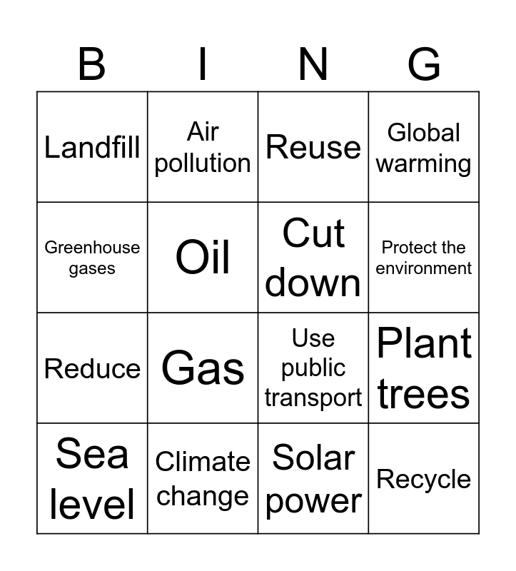 This bingo card has 16 words: Climate change, Plant trees, Reuse, Landfill, Reduce, Air pollution, Use public transport, Solar power, Greenhouse gases, Oil, Sea level, Global warming, Gas, Protect the environment, Cut down and Recycle.