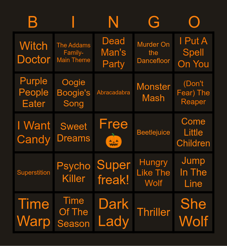 This bingo card has a free space and 34 words: Somebody's Watching Me, Thriller, This Is Halloween, Ghostbusters, Superstition, Oogie Boogie's Song, I Put A Spell On You, Time Warp, The Addams Family- Main Theme, Spooky, Scary Skeletons, Abracadabra, Dead Man's Party, Witchcraft, Season Of The Witch, Beetlejuice, (Don't Fear) The Reaper, Time Of The Season, I Want Candy, Psycho Killer, Hungry Like The Wolf, Super freak!, Heads Will Roll, Witch Doctor, Come Little Children, Dark Lady, She Wolf, Murder On the Dancefloor, Your Idol, Monster Mash, Purple People Eater, Puttin On The Ritz, Sweet Dreams, Jump In The Line and Banana Boat (Day-O).