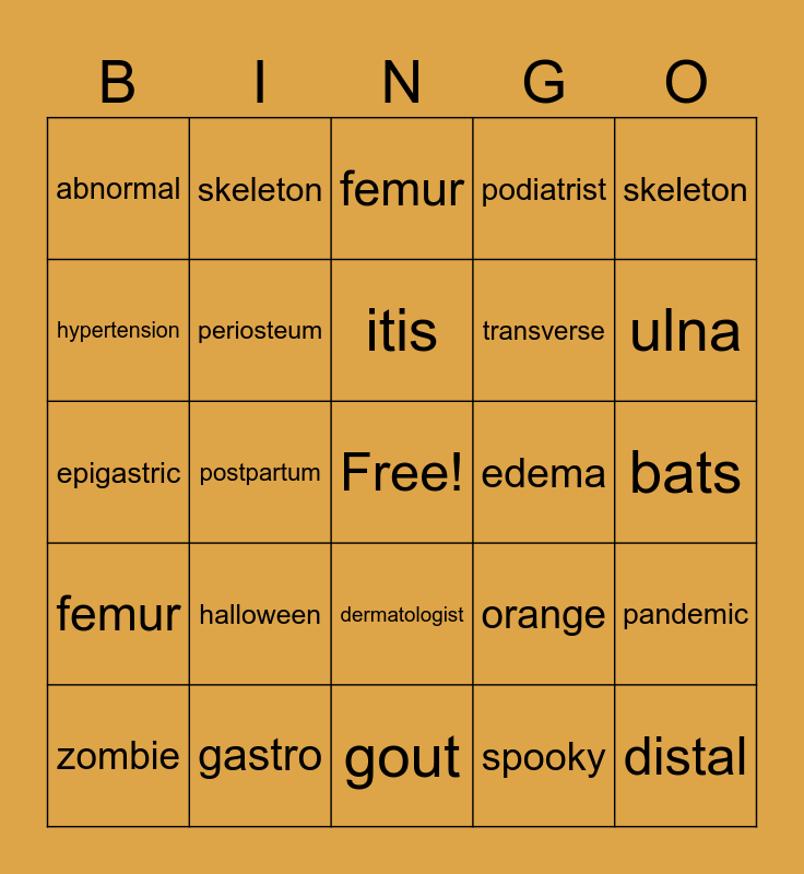 This bingo card has a free space and 24 words: halloween, gastro, itis, zombie, skeleton, abnormal, hypertension, skeleton, edema, dermatologist, transverse, epigastric, orange, pandemic, periosteum, spooky, bats, femur, ulna, postpartum, distal, femur, podiatrist and gout.