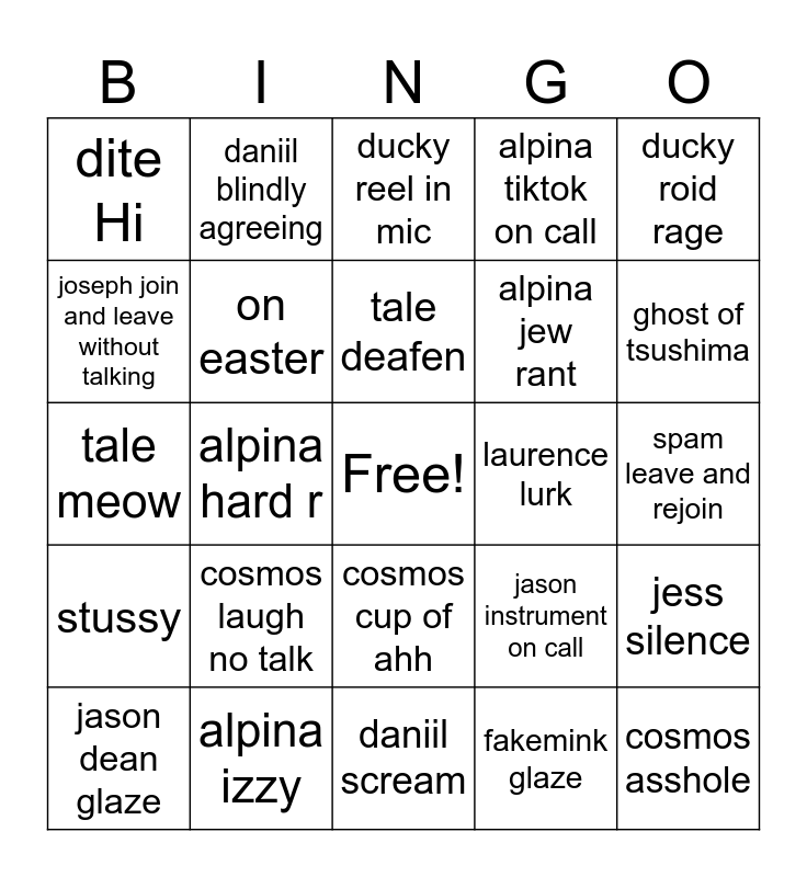 This bingo card has a free space and 24 words: cosmos laugh no talk, alpina izzy, tale deafen, jason dean glaze, ducky roid rage, dite Hi, joseph join and leave without talking, daniil blindly agreeing, laurence lurk, cosmos cup of ahh, alpina jew rant, tale meow, jason instrument on call, jess silence, on easter, fakemink glaze, spam leave and rejoin, ducky reel in mic, ghost of tsushima, alpina hard r, cosmos asshole, stussy, alpina tiktok on call and daniil scream.