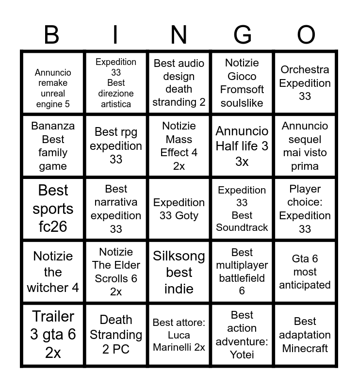This bingo card has a free space and 24 words: Notizie The Elder Scrolls 6 2x, Death Stranding 2 PC, Notizie Mass Effect 4 2x, Trailer 3 gta 6 2x, Orchestra Expedition 33, Annuncio remake unreal engine 5, Bananza Best family game, Expedition 33 Best direzione artistica, Expedition 33 Best Soundtrack, Silksong best indie, Annuncio Half life 3 3x, Best sports fc26, Best multiplayer battlefield 6, Gta 6 most anticipated, Best rpg expedition 33, Best action adventure: Yotei, Player choice: Expedition 33, Best audio design death stranding 2, Annuncio sequel mai visto prima, Best narrativa expedition 33, Best adaptation Minecraft, Notizie the witcher 4, Notizie Gioco Fromsoft soulslike and Best attore: Luca Marinelli 2x.