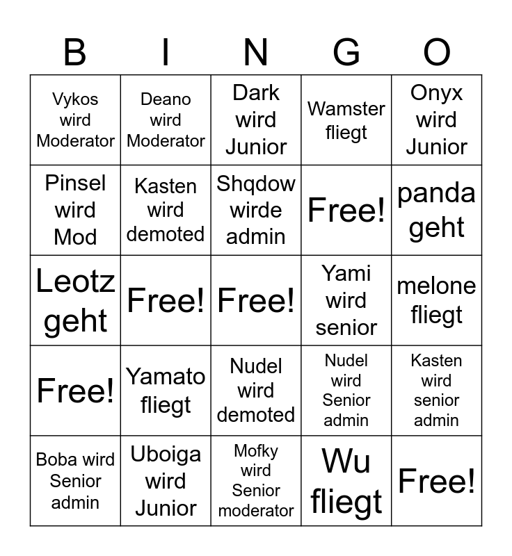 This bingo card has a free space and 24 words: Boba wird Senior admin, Yamato fliegt, Shqdow wirde admin, Wu fliegt, Onyx wird Junior, Vykos wird Moderator, Deano wird Moderator, Dark wird Junior, Yami wird senior, melone fliegt, Leotz geht, Kasten wird demoted, Nudel wird Senior admin, Kasten wird senior admin, Pinsel wird Mod, Uboiga wird Junior, Mofky wird Senior moderator, Wamster fliegt, panda geht, Free!, Free!, Nudel wird demoted, Free! and Free!.