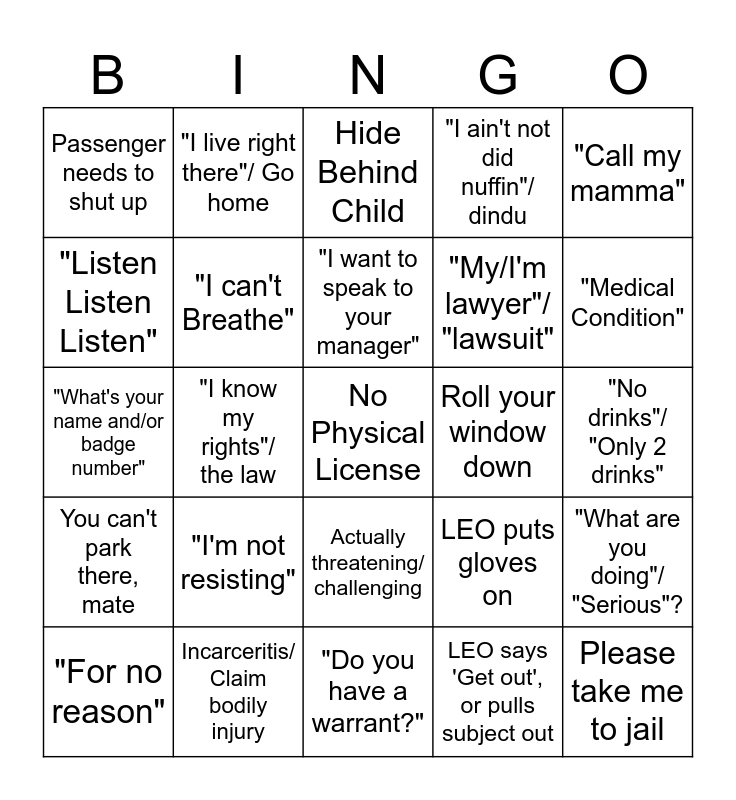 This bingo card has 38 words: Free!, "Stop Touching Me", Camera/ "I record"/ Bodycam, "I can't Breathe", "What are you doing"/ "Serious"?, "I'm not resisting", "I want to speak to your manager", "My Brother a COP", "Call my mamma", "My/I'm lawyer"/ "lawsuit", "I know my rights"/ the law, "I ain't not did nuffin"/ dindu, No Physical License, "No drinks"/ "Only 2 drinks", "Listen Listen Listen", You can't park there, mate, "That's not mine", Hide Behind Child, Open door uninstructed/ instigation, Roll your window down, Passenger needs to shut up, Incarceritis/ Claim bodily injury, "Medical Condition", "For no reason", "My Phone" / "Where's my phone", "Do you have a warrant?", Please take me to jail, Double Down, I know you are but what am I, "I'm being harassed"/ "I am victim", "Are you threatening me?", Actually threatening/ challenging, LEO says 'Get out', or pulls subject out, "I live right there"/ Go home, Warrant for Arrest/search exists, LEO puts gloves on, "What's your name and/or badge number" and Calling for help that will never come.