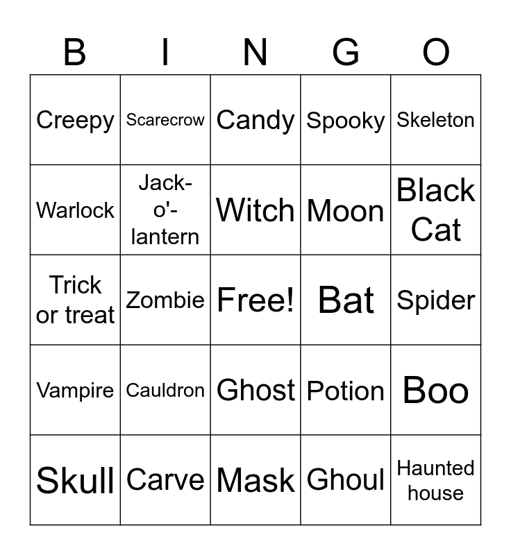 This bingo card has a free space and 40 words: Costume, Trick or treat, Pumpkin, Jack-o'-lantern, Carve, Ghost, Witch, Monster, Skeleton, Vampire, Zombie, Spooky, Haunted house, Spider, Bat, Cauldron, Scary, Creepy, Candle, Candy, Boo, Ghoul, Moon, Warlock, Sorcerer, Frighten, Werewolf, Curse, Scream, Frankenstein, Mummy, Skull, Broomstick, Potion, Black Cat, Mask, Afraid, Wicked, Scarecrow and Halloween.